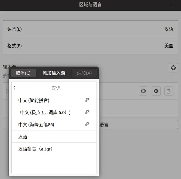 设置,在区域和语言中选择添加输入源,很多基于IBus的中文输入法基本可以满足输入需求;![]()