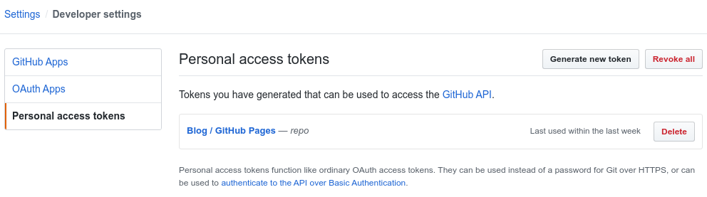 使用github personal access token实现部署 类似于 Google 两步验证中的备用验证码 ,不过google token是单次生成(可见/查询)使用后销毁,github personal token是单次生成销毁(不可见)多次使用。