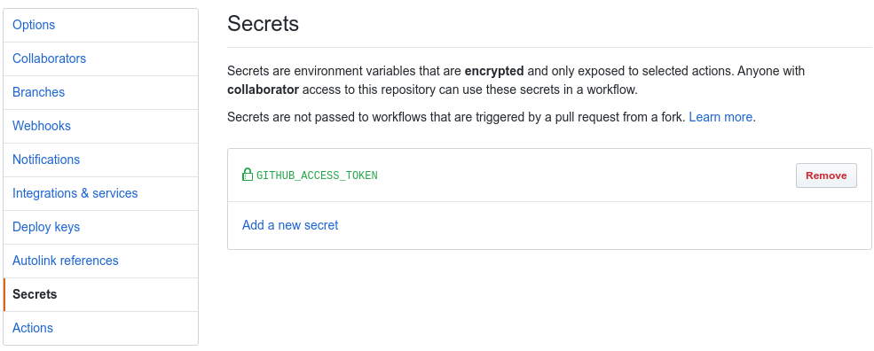 上一步生成的 token 我们不能以明文形式存放,所以要设置为仓库的 Secrets,这样就可用 Secrets 隐式引用 token。依次进入(仓库的)setting >> Secrets >> Add a new secret,名称填 GITHUB_ACCESS_TOKEN,内容填刚刚的token。